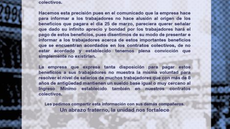 Compañeras/os junto con saludarlas/os compartimos un nuevo comunicado sobre Gratificación Pactada y Bono de merma, aclarando la voluntad del...